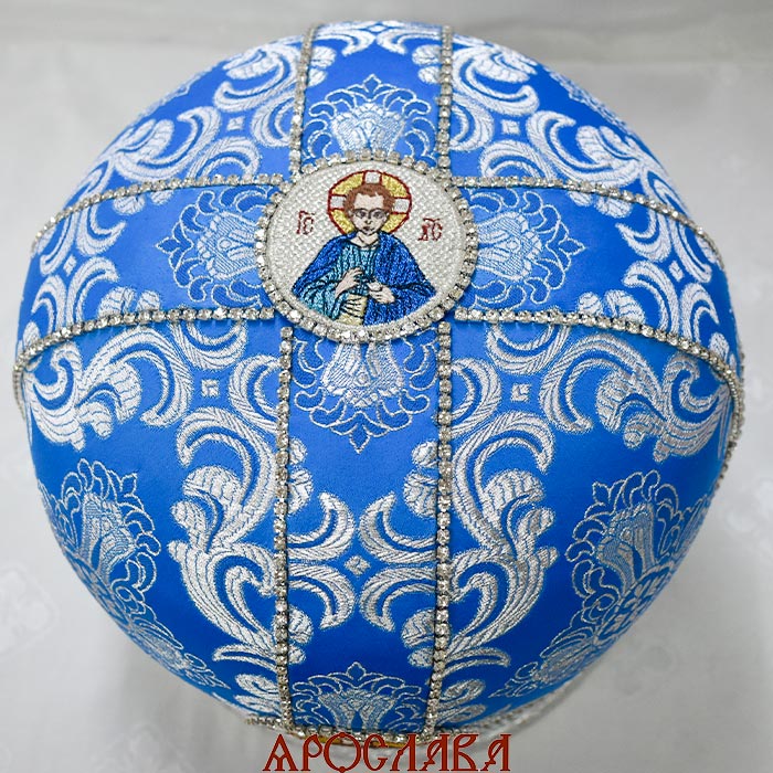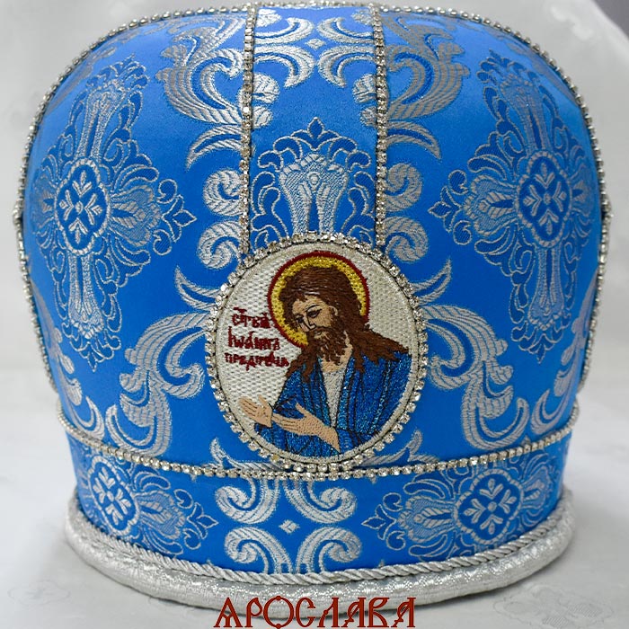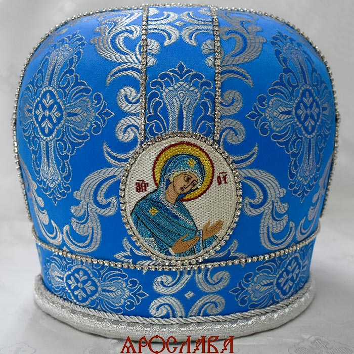 АРТ2803. Митра голубая с серебром парча. Иконы вышитые. Расшита стразовой дорожкой.