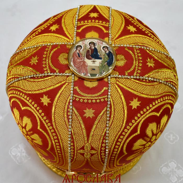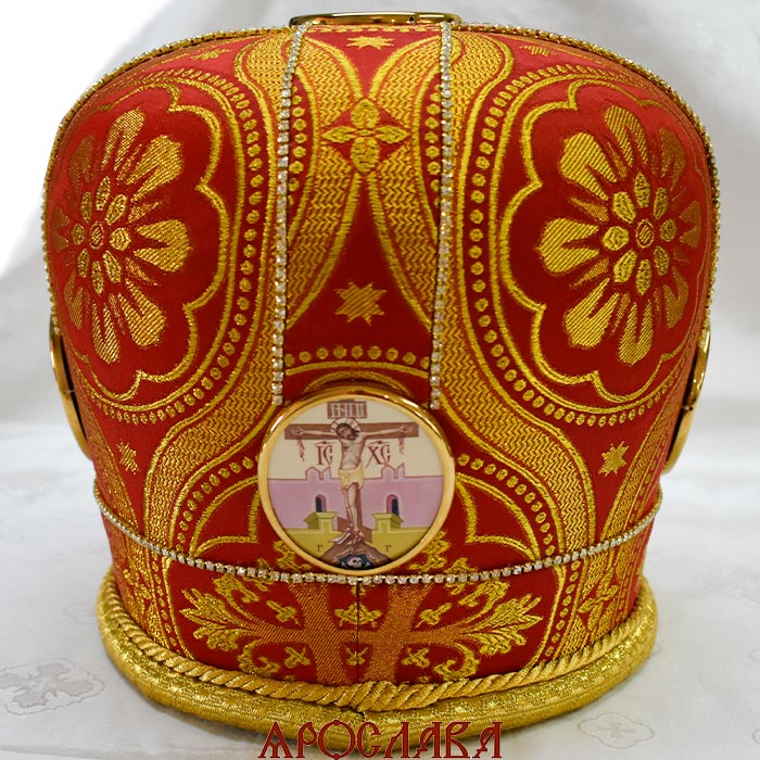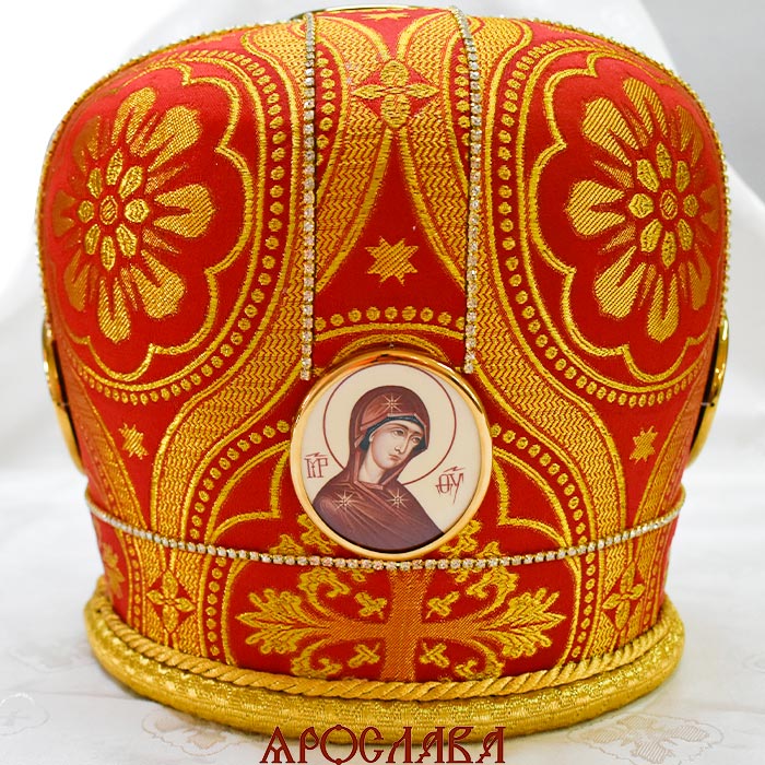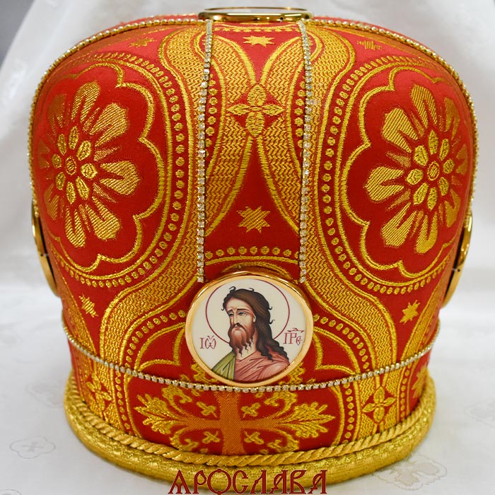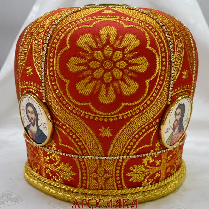 АРТ2834. Митра красная парча. Иконы в рамке. Расшита стразовой дорожкой.