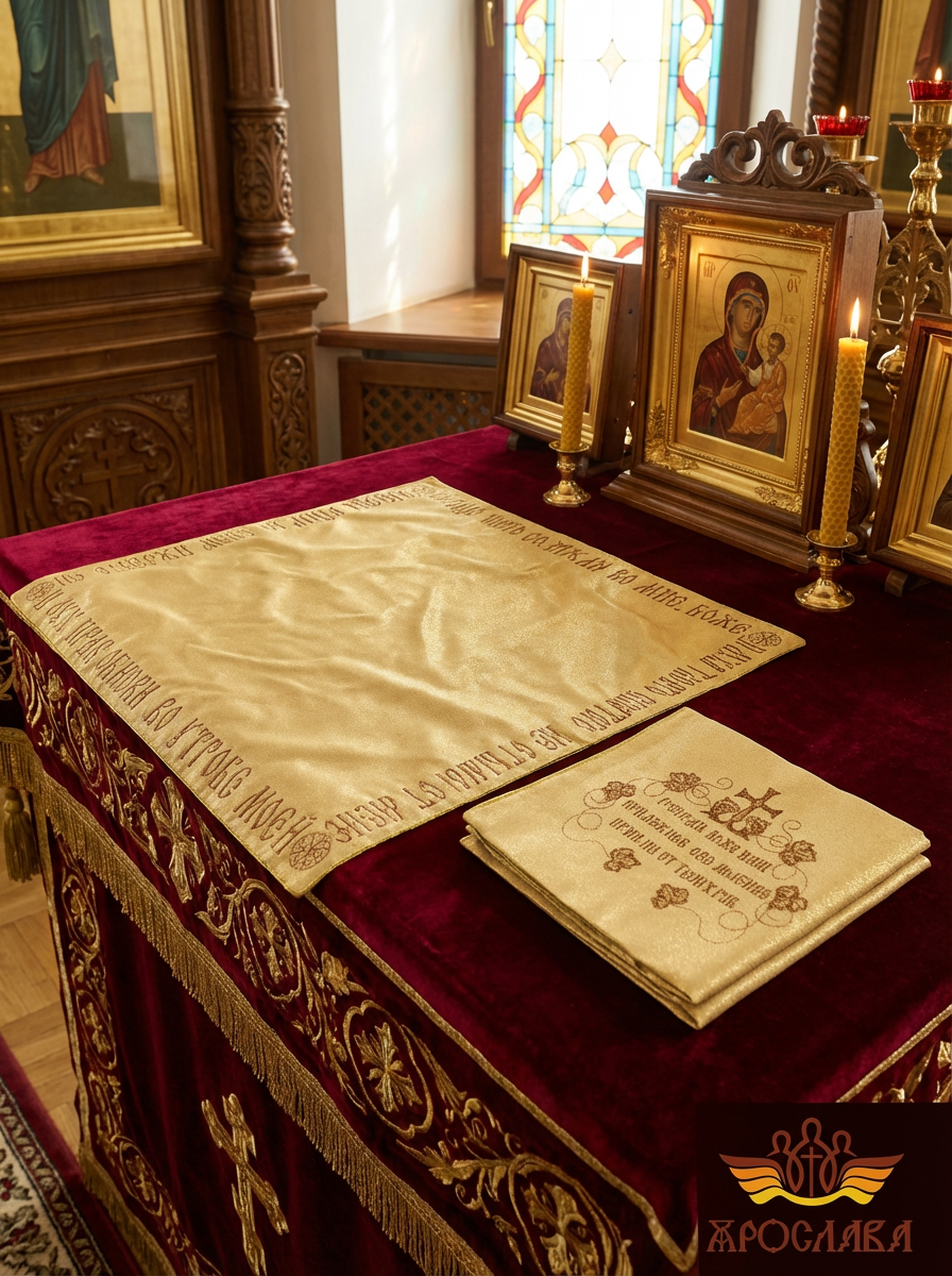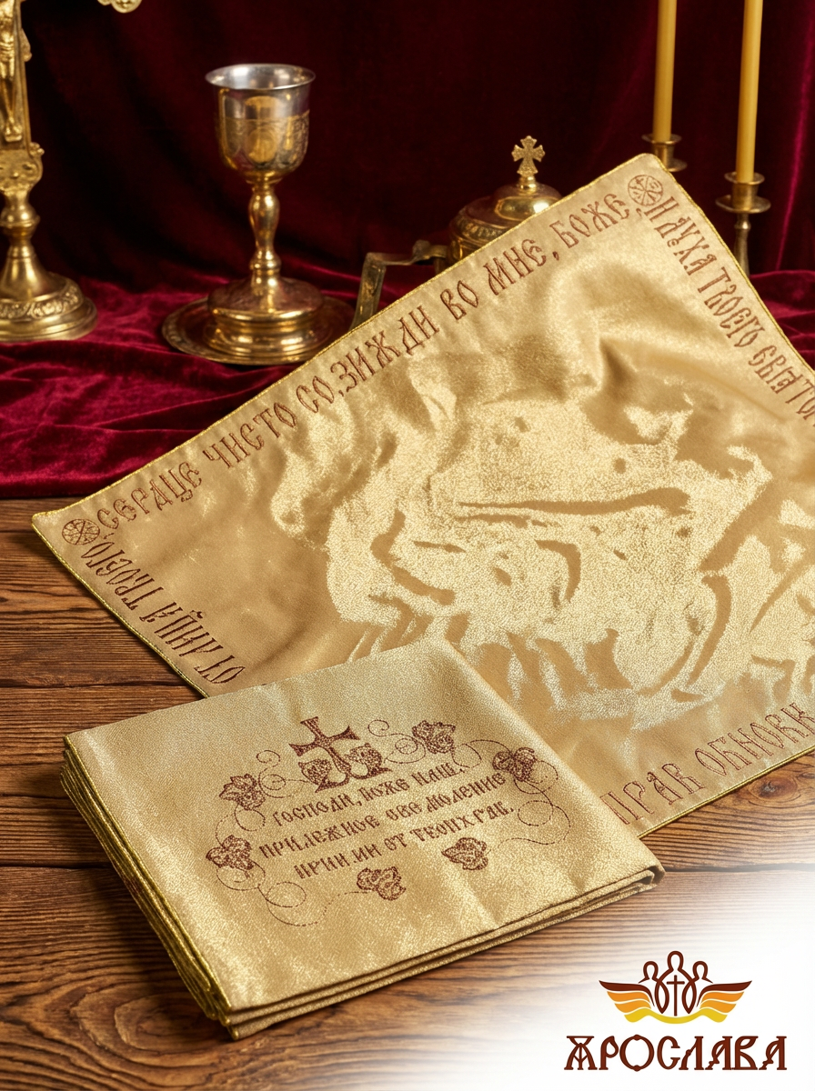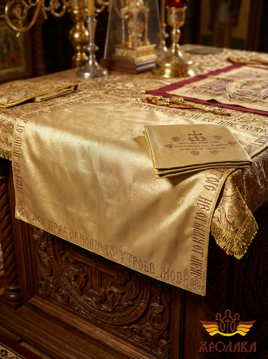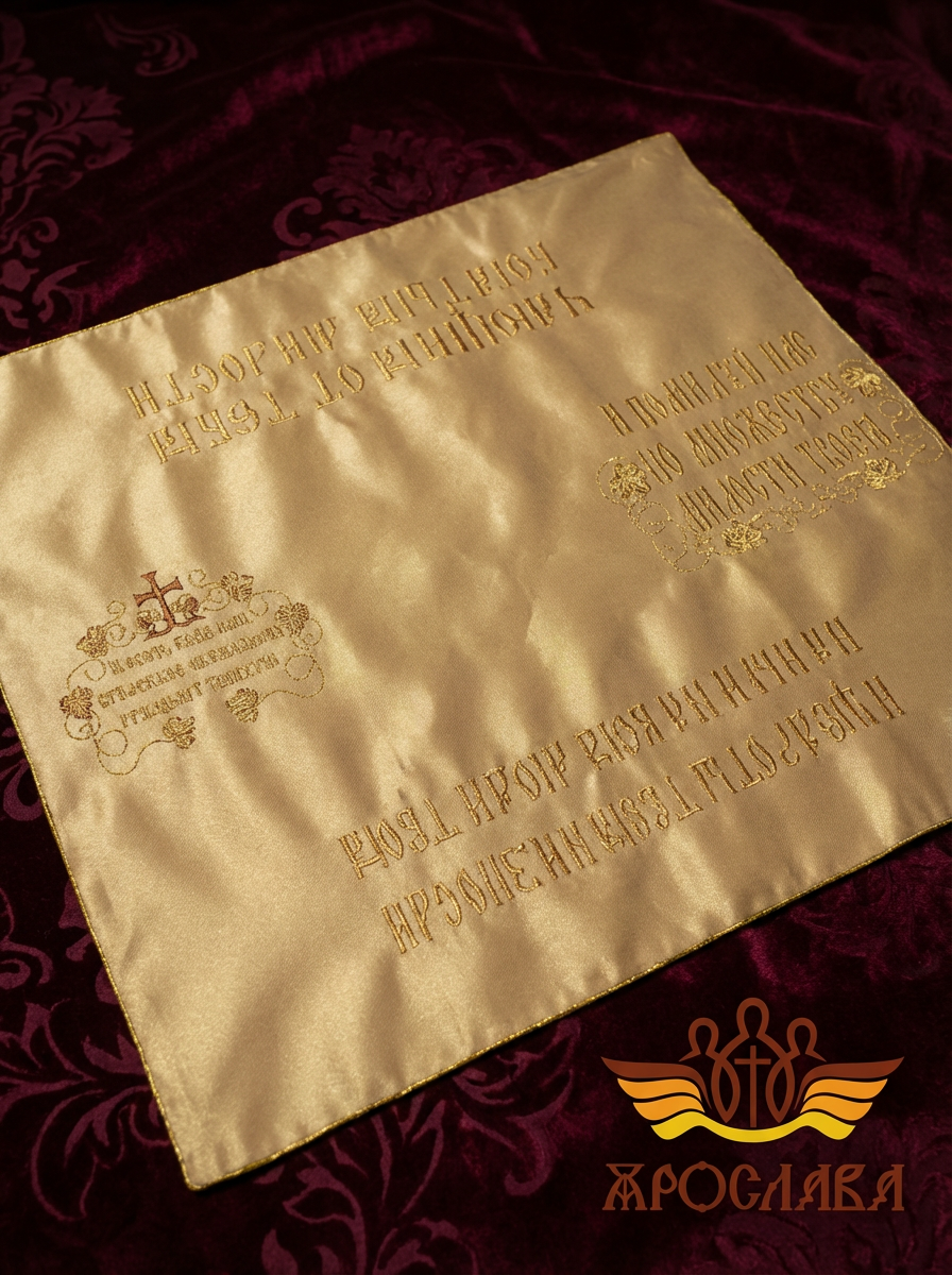 Предлагаем илитон из качественной ткани однотонный атласный шелк или греческий муар на выбор заказчика. Изделие украшено вышивкой, в края илитона вставлен кант золотого цвета.