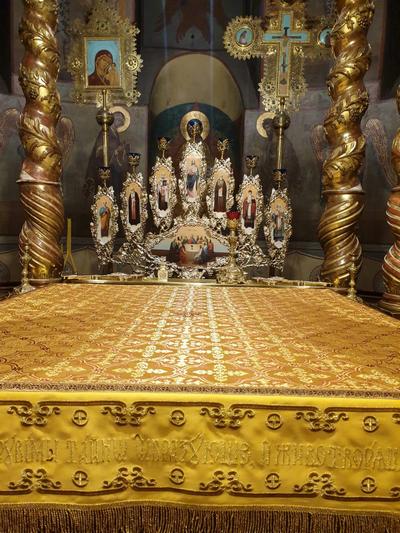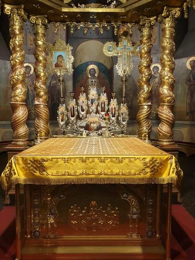 Скатерть на престол (жертвенник) изготавливается из однотонного атласного шелка, комбинированная с парчой.